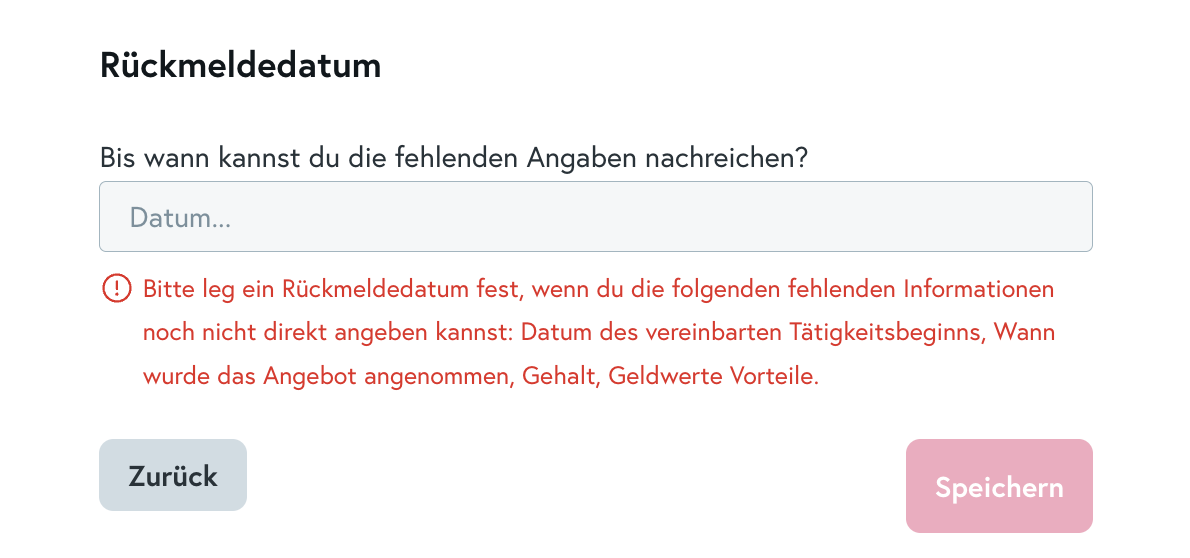 Sollten dir im Einstellungs-Formular selber Informationen fehlen, so wird dir ein Hinweis angezeigt, welche Angaben du noch machen musst. Du kannst an dieser Stelle ebenfalls ein Rückmeldedatum auswählen. Sollte der/die Kandidat:in noch nicht im Status mündliche Zusage sein, so wird er nun in diesen verschoben. Du wirst zu dem Datum von uns per Mail noch einmal erinnert.