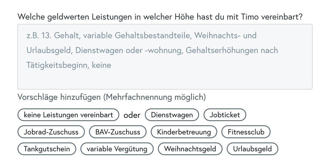 Vorschläge für geldwerte Leistungen können direkt aus den Angaben unterhalb des Feldes übernommen werden, ebenso die Vorlage "keine Leistungen vereinbart".