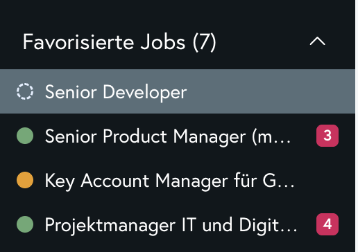 Bei deinen favorisierten Jobs links in der Sidebar erkennst du an dem Icon neben dem Jobtitel, ob er sich im Status "Entwurf", "aktiv" oder "pausiert" befindet. In dem folgenden Beispiel ist der oberste Job ein Entwurf (schwarzer Kreis mit grau gestricheltem Rand), der zweite Job aktiv (grüner Kreis) und der dritte Job pausiert (gelber Kreis).
